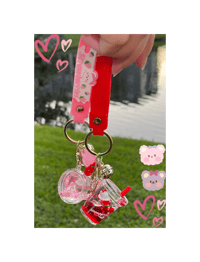 These strawberry series of boba cup keychains comes with strawberry charm, a bell, a clip and the holding strap. Cups have tiny imitation ice, matching color pearls, and glitter. The floating figure is a mini bear. Check our the instagram link for a short video!
